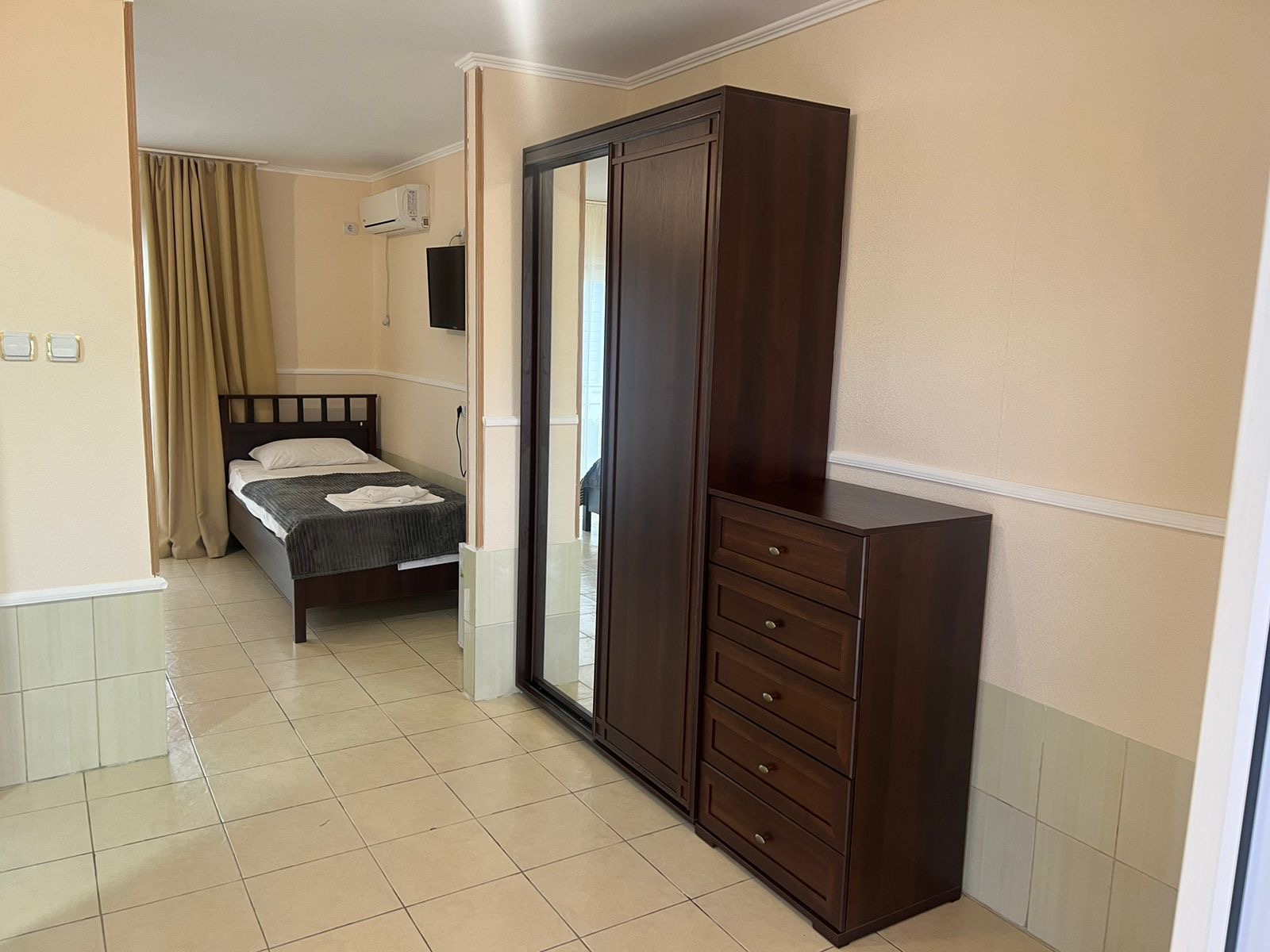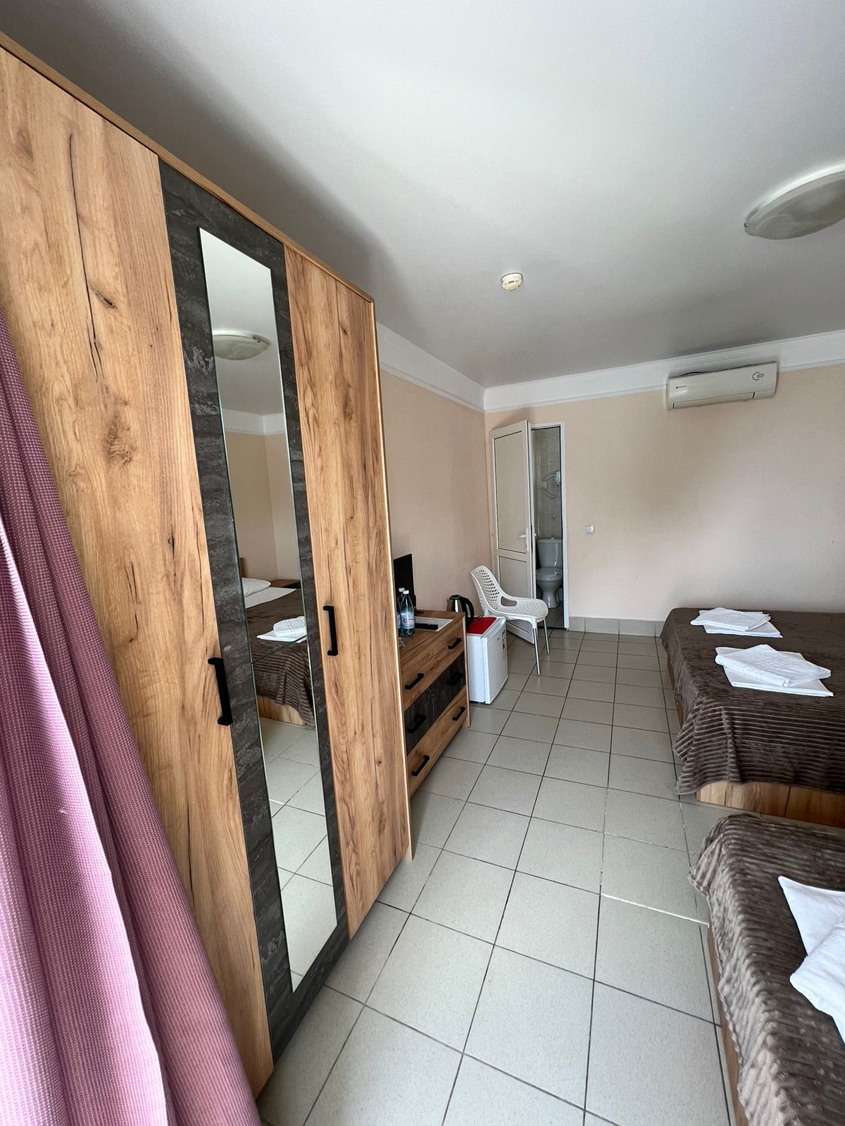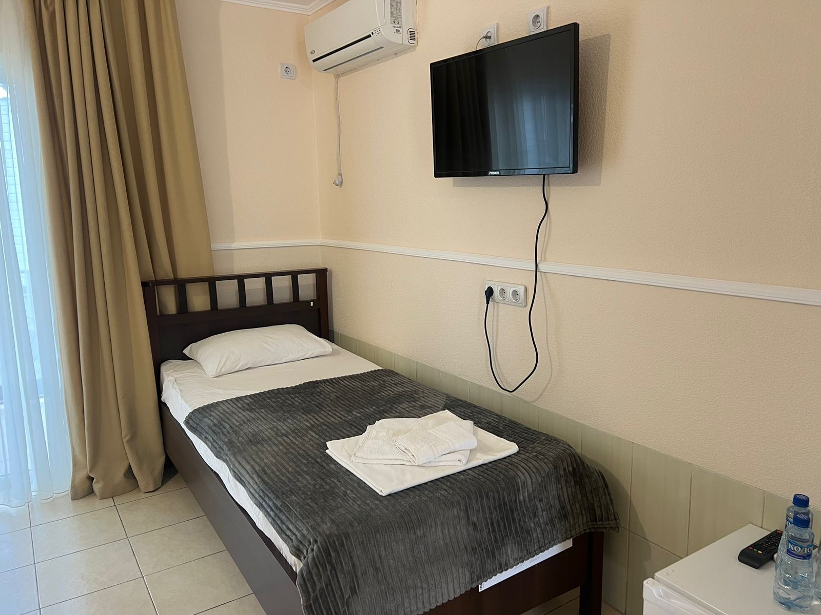 В номере: кабельное телевидение, кондиционер, санузел, душ, холодильник, балкон, одна кровать 2- х спальная и вторая 2-х ярусная кровать.
