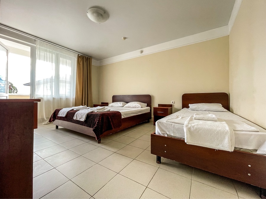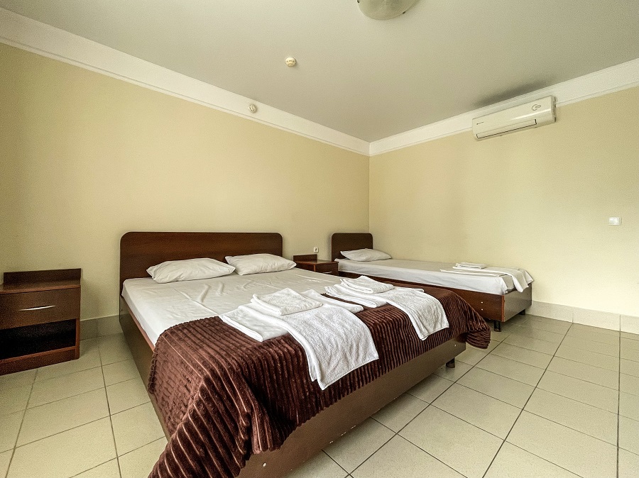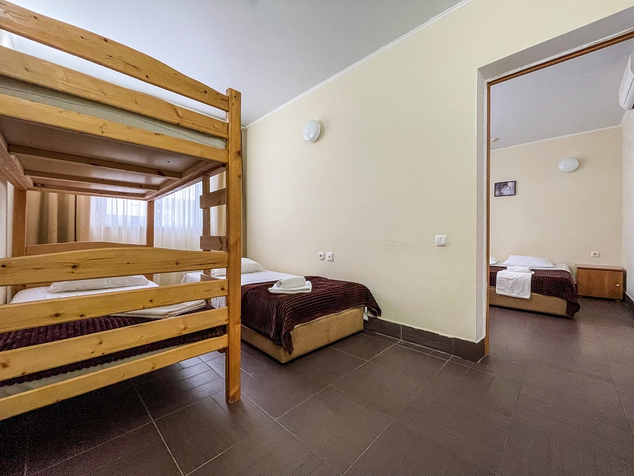 В номере: кабельное телевидение, кондиционер, санузел, душ, холодильник, балкон, 2-х спальная кровать, 1-спальные кровати, 2-х ярусная кровать